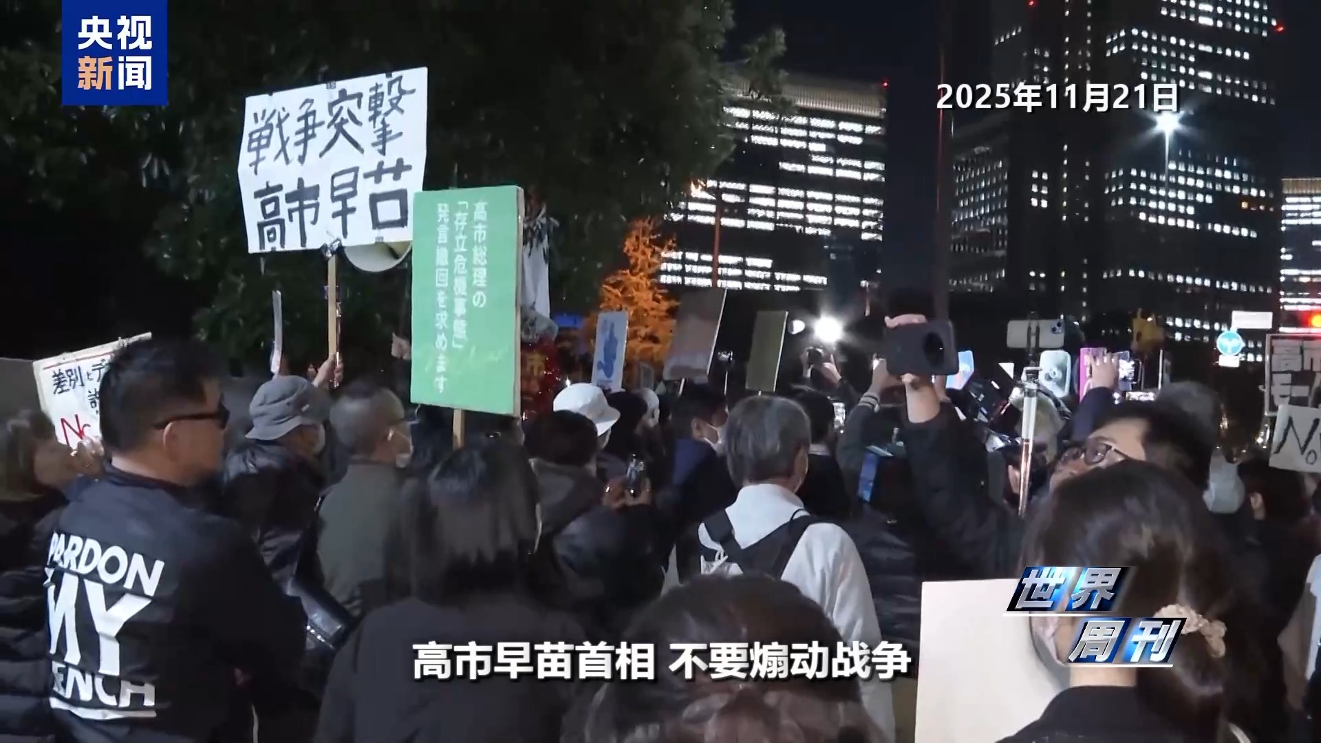 11月21日晚,数千名抗议者聚集在首相官邸前,强烈要求高市早苗撤回不实言论。