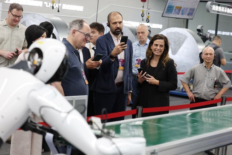 第二届世界汉学大会中外嘉宾参观张江市“国家和区域仿人机器人创新中心”的机器人培训。图片由赖新林提供。